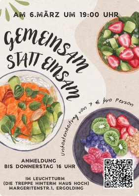 Im Leuchtturm, Margeritenstr. 1, Ergolding (Die Treppe hinter dem Haus hoch) Wir laden Euch herzlich ein zu einem netten Abend mit leckerem Essen! Begrenzte Teilnehmerzahl Unkostenbeitrag 7 Euro Melde dich gerne bis Donnerstag hier an