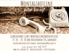 Für eine Stunde bringen wir jeden Montag von 19.30bis 20.30 Uhr gemeinsam unsere Anliegen vor Gott. Das können ganz verschiedene Bitten sein, von sehr Persönlichem, über Bitten für die Gemeinde, bis hin zu unserer Stadt und der Welt. Du bist herzlich eingeladen, mitzubeten..